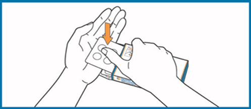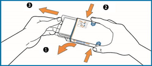 - Prima simultaneamente os ganchos situados em ambos os lados da embalagem exterior com o indicador e o polegar, e mantenha-os premidos.